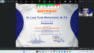Acara kemudian dilanjutkan dengan penyerahan sertifikat kepada Dr. Lusy Tunik Muharlisiani, M.Pd., sebagai bentuk apresiasi atas kontribusi dan pemaparan materi yang sangat bermanfaat.