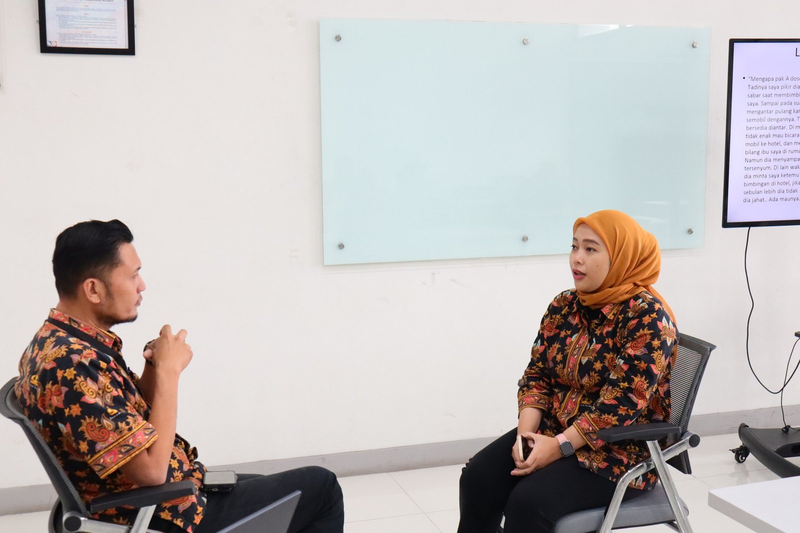 Selain paparan konseptual dan diskusi interaktif, kegiatan dilengkapi dengan simulasi role play berbasis studi kasus. Dalam sesi ini, peserta berlatih menerima laporan, melakukan penggalian informasi, serta memberikan dukungan awal termasuk teknik relaksasi sederhana seperti pernapasan 4-7-8 dan grounding untuk membantu menstabilkan kondisi emosional korban.